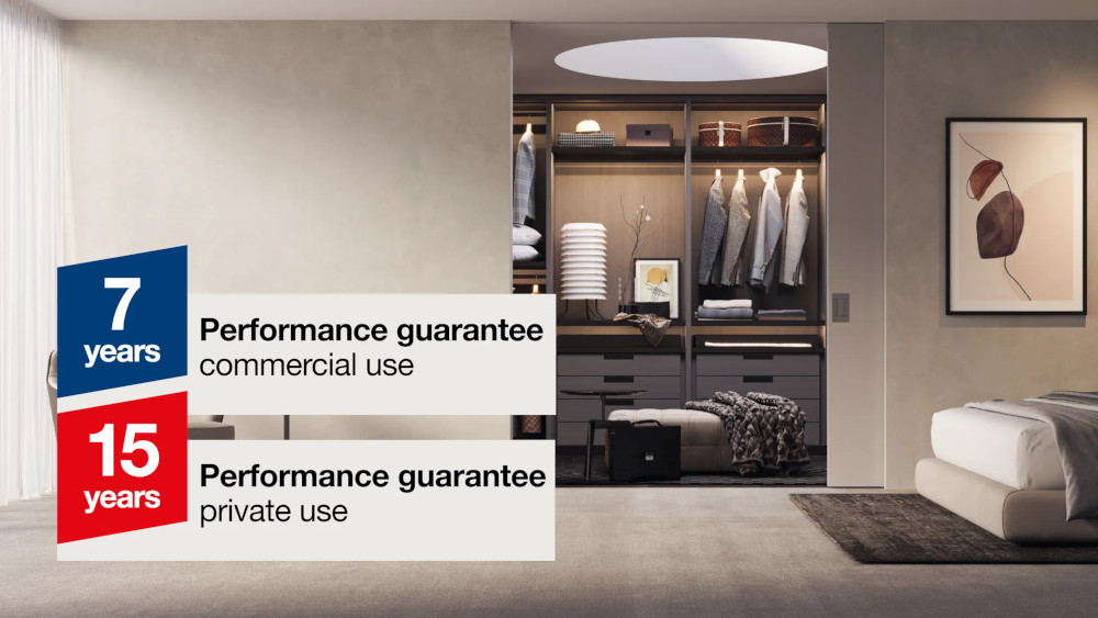 Hawa Junior 100 isesulguva mehhanismi jaoks on kogenud Šveitsi tootja Hawa Sliding Solutions andnud 15-aastase esituse garantii uskumatult madala maksimaalse avamise jõuga 22 N erakasutuses ja 7 aastase kaubanduslikus kasutamises. .