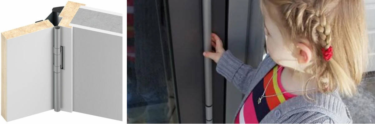 ATHMER pakub lahendust ka hingede poolele: rullikulaadne kaitse, mis paigaldatakse ukse sulgumise poolele. See katab vahe ukselehe ja ukseraami vahel, säilitades turvalisuse jaoks pideva pinge. Kuna vahe on kaetud, ei saa laste sõrmed sinna vahele jääda.