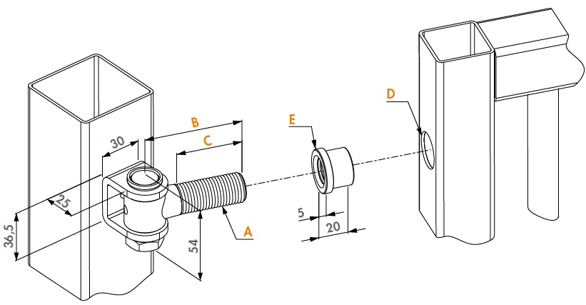 | Hingetüüp | Kandevõime (kg) | A | B (mm) | C (mm) | D (mm) | E (mm) |