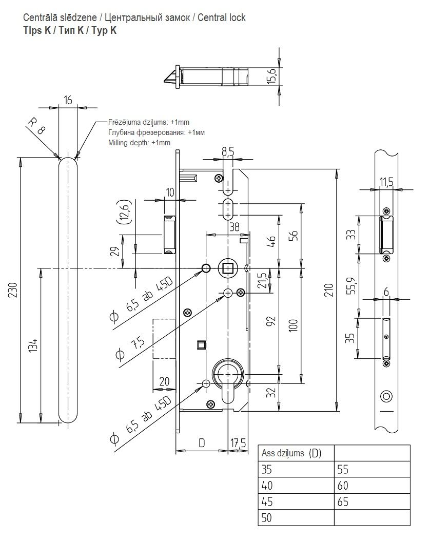 - telje D sügavus standardluku puhul: 45 mm