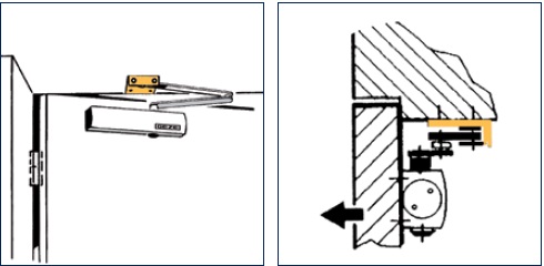 - paigaldus ukse tõukepoolele - sulguri korpus on ukse lehe peal, tõukevars on kruvitud kasti põhja külge manuaalse paigaldusnurgaga