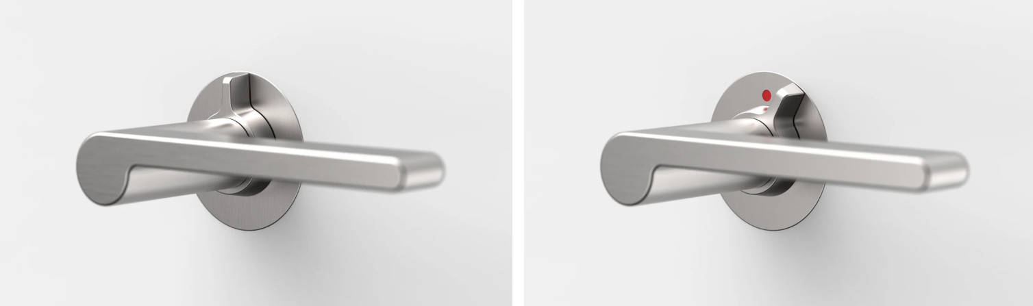 The locking mechanism is concealed within the rose. The red indicator signals that the door is locked and the room is occupied for the moment. The rose is also equipped with an emergency release function: the rose can be unlocked from the outside via coin-turn. No additional privacy (WC) rose is required.