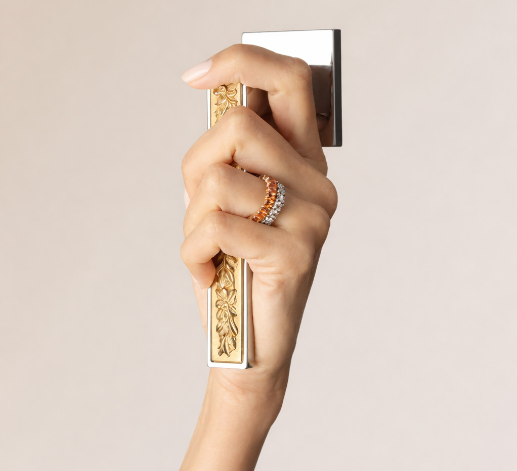 Like a jewel, the handle blends seamlessly with the door surface, designed for those who seek visual balance and clarity of form.