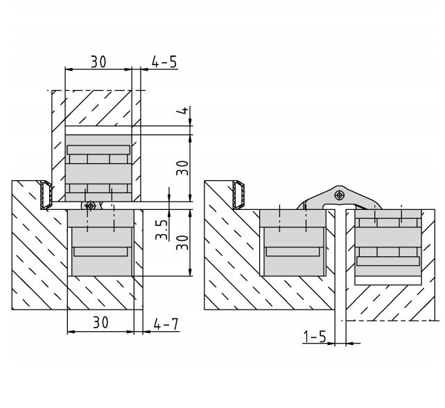 - compatible with self-closing concealed hinge DXS 61 3-D "close" (max door weight per pair: 50 kg)