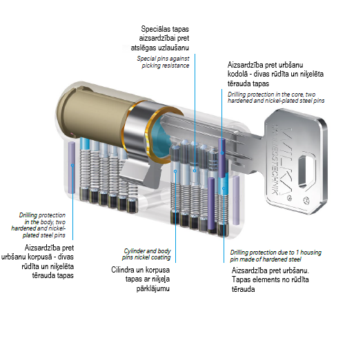 - sfērisks cilindra kodols nodrošina precīzu atslēgas vadību